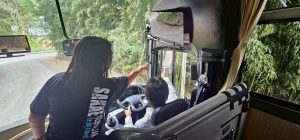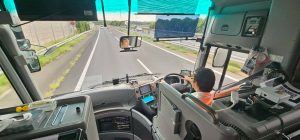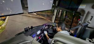 3枚目の写真は、高速道路での走行訓練の様子です。お客様に不安や不快感を与えないよう、安定した速度を維持し、十分な車間距離を確保することはもちろん、追い越しや合流の際には、バスの全長と死角を常に意識した、周囲への気配りが求められます。モニターやミラーを駆使し、絶えず交通状況の先を読むことで、滑らかで安全な運転が実現します。