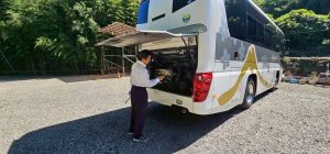 2枚目の写真では、バス後部のエンジンルームを開け、内部の点検を行っています。エンジンオイルや冷却水の量、ファンベルトの張り具合や損傷の有無など、点検項目は多岐にわたります。指導員からは、マニュアル通りの点検だけでなく、長年の経験で培われた五感を使った点検の重要性も伝えられました。車両からの小さなサインも見逃さない観察眼を養うことが、トラブルを未然に防ぎ、お客様を安全にお運びする上で不可欠です。
