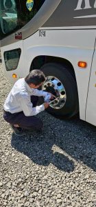 1枚目の写真では、点検ハンマーを手に、タイヤのホイール・ナットに緩みがないか、打音で一つひとつ確認しています。高速走行中にタイヤが脱落するような重大事故を未然に防ぐための、地味ながらも欠かすことのできない重要な作業です。また、タイヤの空気圧や摩耗状態、亀裂の有無なども自らの目で厳しくチェックします。